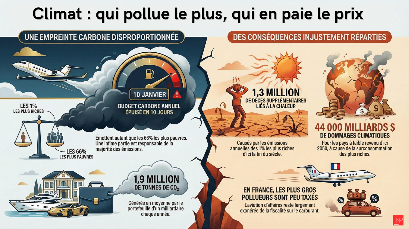 Cette moyenne masque toutefois des écarts considérables. Selon Oxfam, les 1 % les plus riches de la planète émettent autant de gaz à effet de serre que les 66 % les plus pauvres. Pire encore, les 0,1 % des plus grandes fortunes avaient déjà épuisé leur budget carbone annuel dès le 3 janvier.